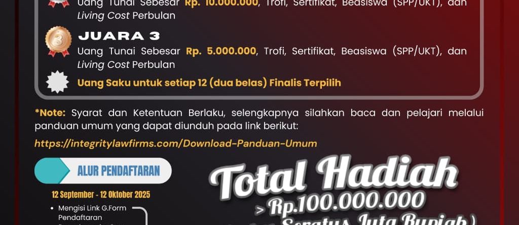 Indrayana Centre for Government, Constitution, and Society (INTEGRITY) Law Firm bekerja sama dengan Fakultas Hukum Universitas Indonesia (FH UI) dan Pusat Studi Hukum Tata Negara (PSHTN) FH UI, mempersembahkan INTEGRITY Scholarship V Tahun 2025/2026. Beasiswa ini terbuka untuk mahasiswa/i Fakultas Hukum & Syariah di seluruh Indonesia, dengan rangkaian seleksi: Tanggal […]